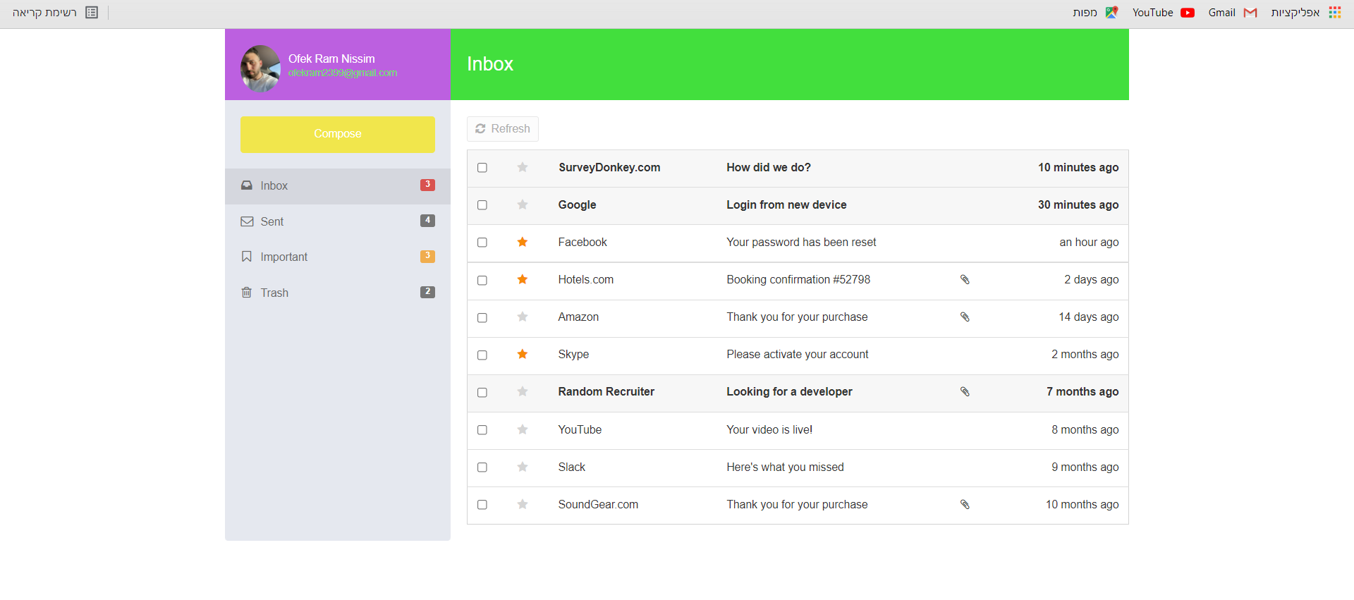 My name is Ofek,i'm 23 years old.I'm Junior Full Stack Developer. Web developer(full stack) student at HackerU colleage. I'm a kind, sociable person that looking for my next challange in web development(full stack), with a willingness to work in teams. Knoledge of JavaScript,Css,Html,Sql, MongoDB,jquery, bootstrap,nodeJs,react.js,next.js,Angular,vue.js,nuxt.js. In addition, have 10 computer study units from Kugel High School in Holon, Israel. 5 units of computer science study in c# and 5 units of study in android (application development). also, i am a freelancer in web development. So let me build your next website! You will not regret it!